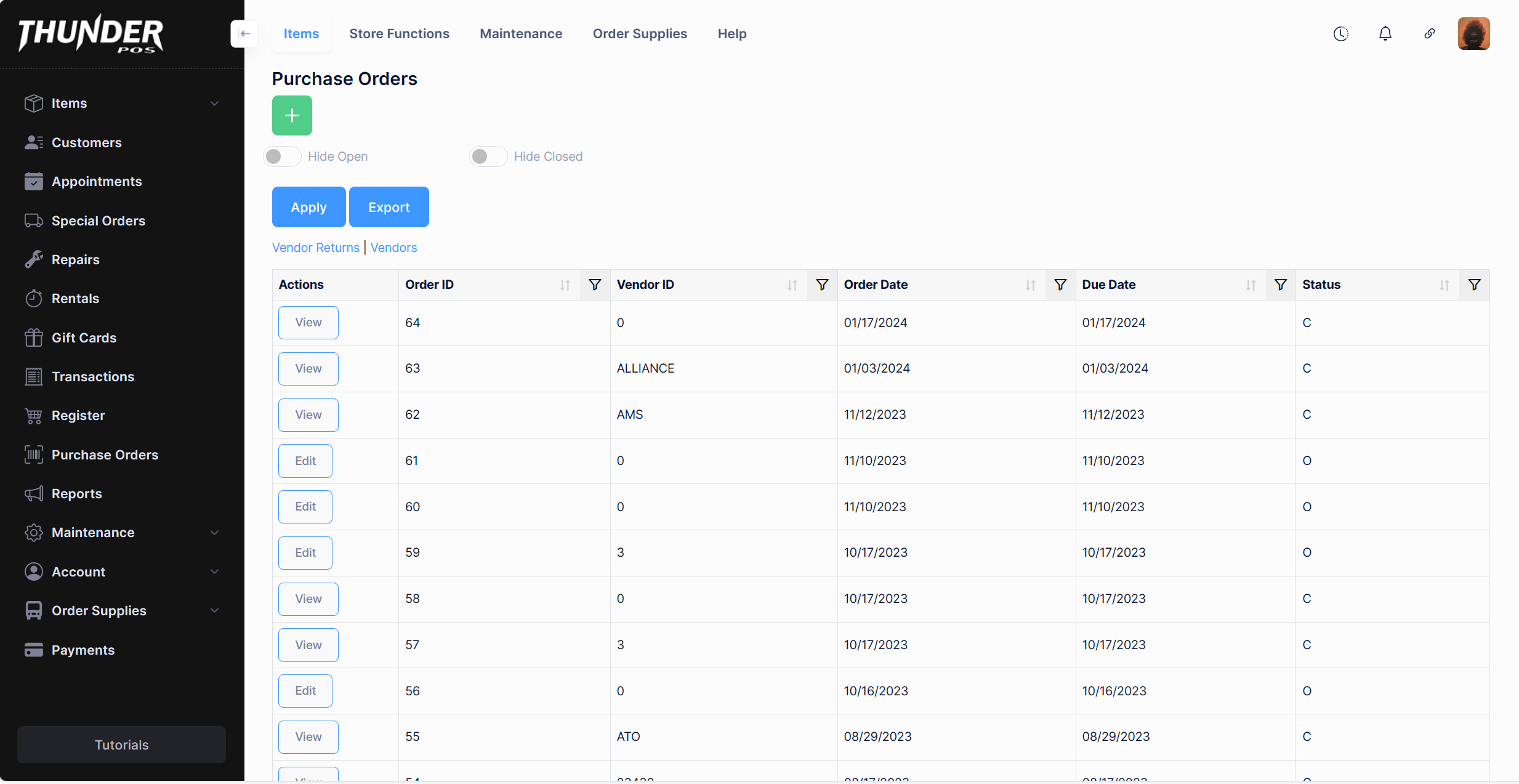 Purchase Orders are one of the primary ways to bring inventory in your system, and create a great paper trail for any future audit needs. You can reach this function through the Purchase Orders option on the main menu.