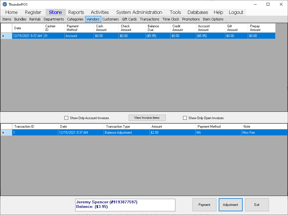 This screen allows you to view the history of a customer's transactions as well as making further transactions not associated with an invoice.