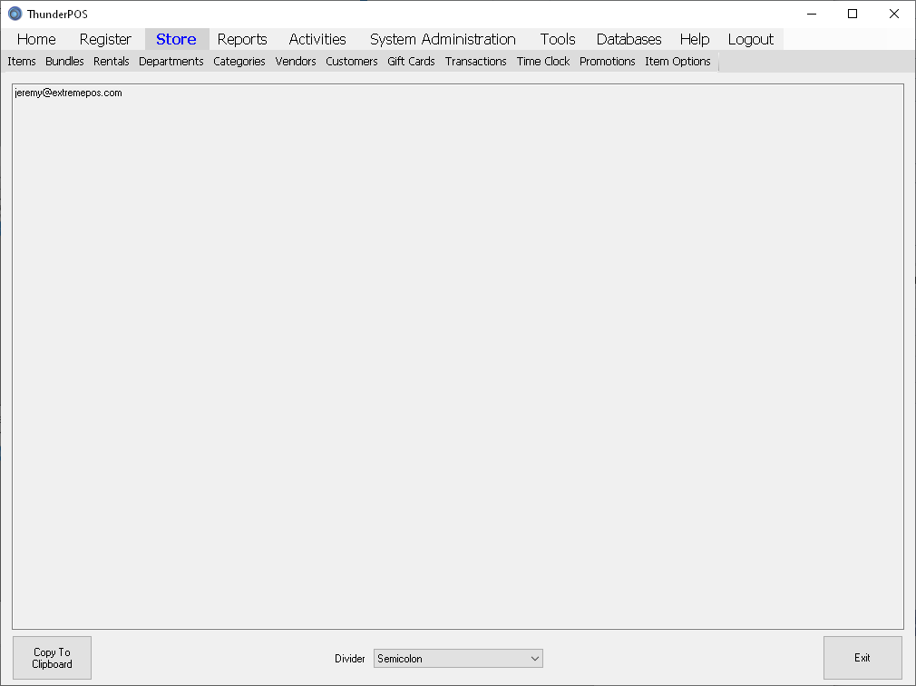 This screen lets you export the email addresses of customers on your current search, for use within email programs for marketing purposes.