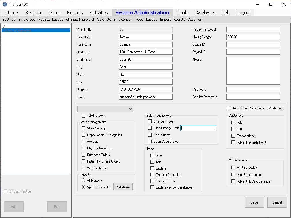 The bottom half of the screen is dedicated to permissions, controlling what the employee can and cannot do within the point of sale.