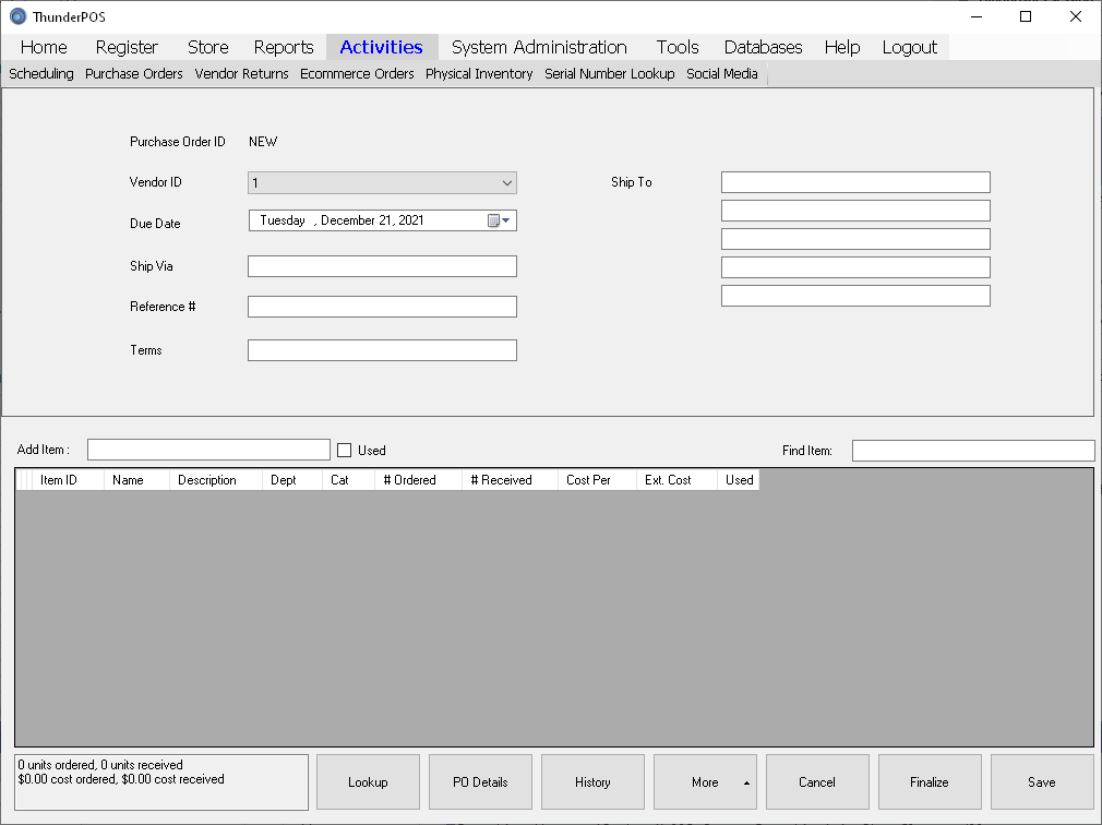 This screen is where you can add items to and receive items on a purchase order. When you create a new one, it will look a lot like this.