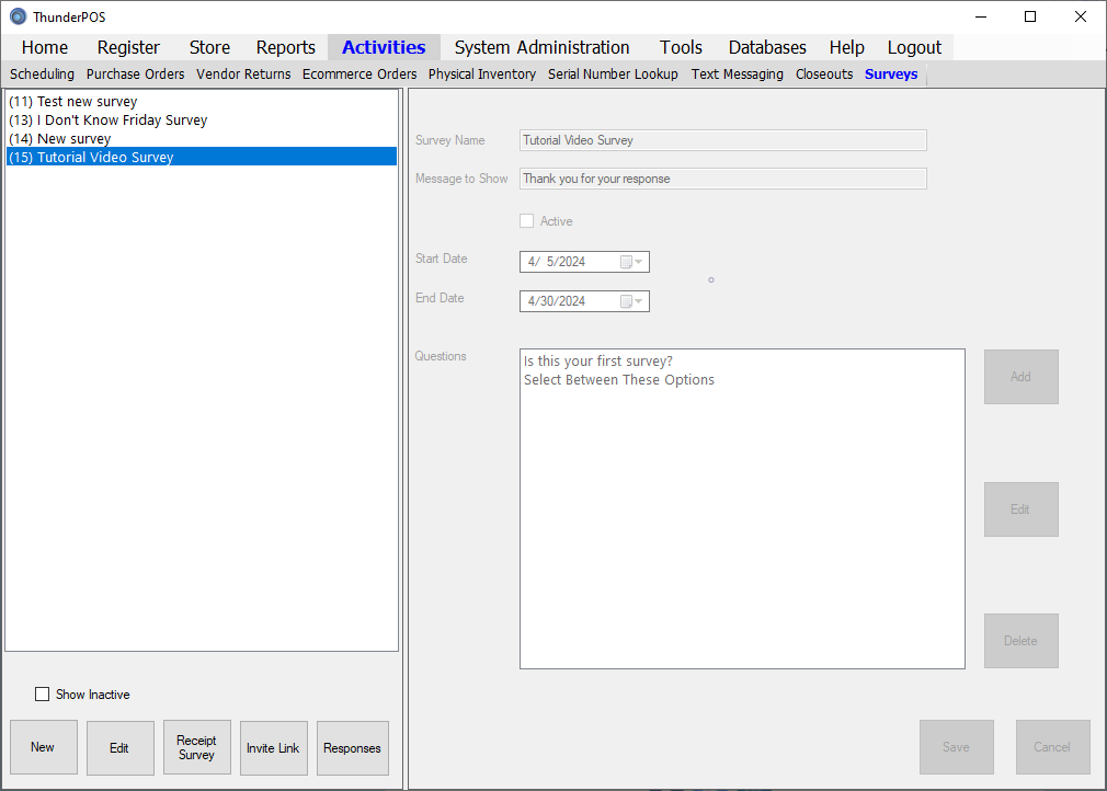 Surveys allow you to poll your customers on issues you may want feedback on. You must be on the cloud version to do surveys.