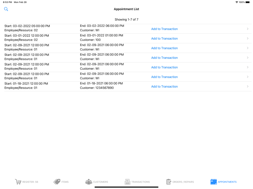 This screen displays a list of appointments made at your store. Appointments are created in the Backoffice.