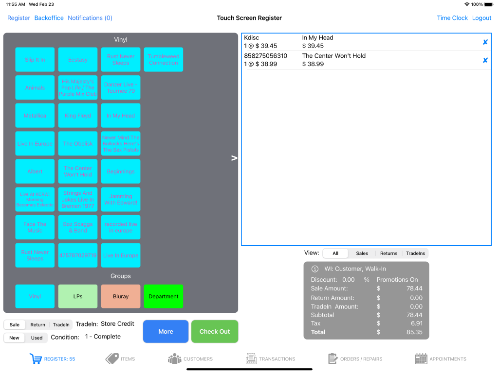 The Touch Screen Register is one of the screens you can choose to process transactions in the store. The other is the Standard Register covered separately.